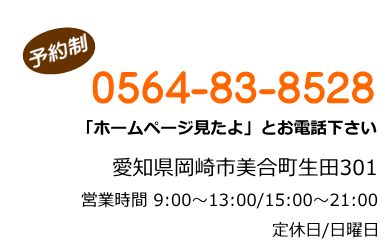 ※祝日も平日と同じように営業しています。定休日 日曜日 電話番号 0564-83-8528